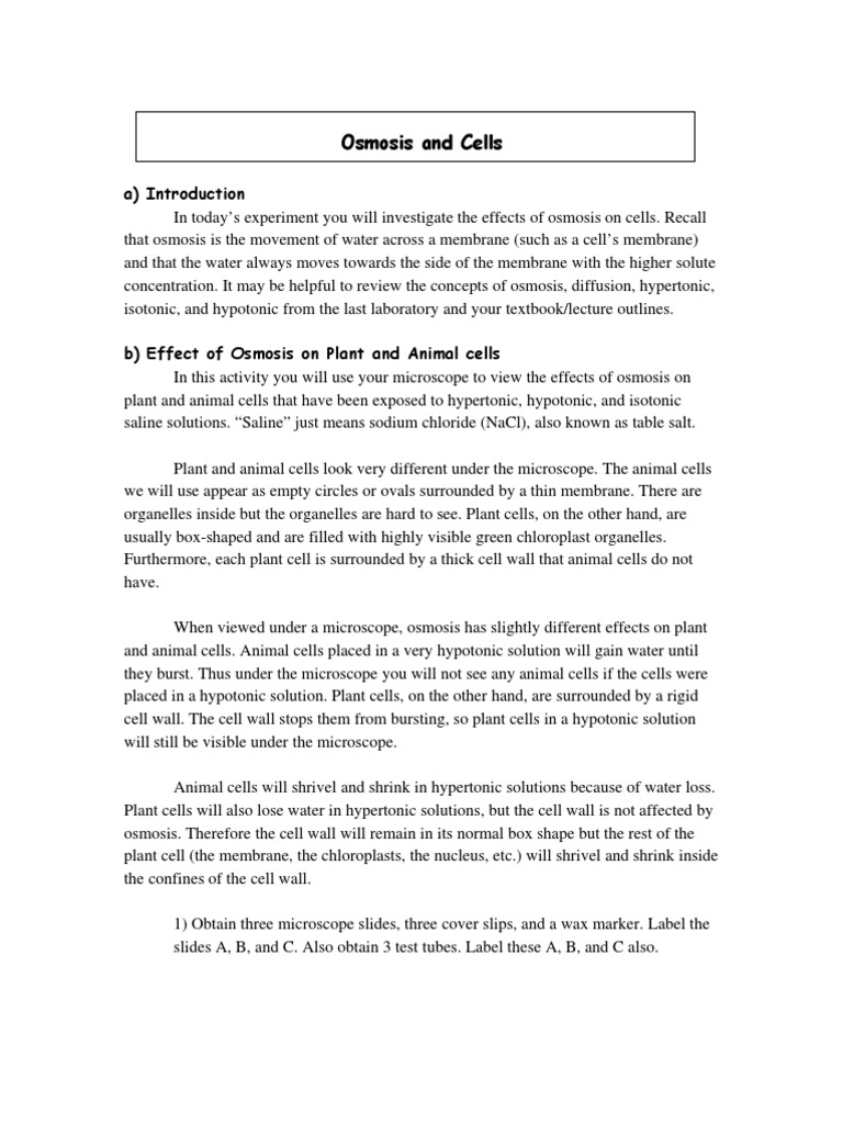 In plants, osmosis aids the absorption of water from the soil and helps transport it right up to the leaves of the plant. Effects of osmosis in plant cells. If the steps above work out properly, the results should be as follows. Osmosis in operation in animal cells. The red blood cells in humans are highly influenced by the osmotic pressure of blood. Plant cells have a cell wall in addition to the usual cell membrane, so the cells are not likely to burst, as can happen in animal cells when too much water enters them by how does the concentration of sucrose affect the weight. There are several factors which. In cellular biology, 'membrane transport' refers to the collection of mechanisms that regulate the passage of solutes, such as ions in a hypertonic solution, the water moves out of the cell and causes the cell to shrivel. Osmosis is how plants are able to absorb water from soil. The cell membrane seperates the contents of the cell from the outside. • what is the explanation for the fact that most cells are small and have how does a plant cell control its internal (turgor) pressure? • how are gradients important in diffusion and osmosis? Water molecules inside the xylem cells are strongly attracted to each other because of hydrogen bonding (this is called cohesion).